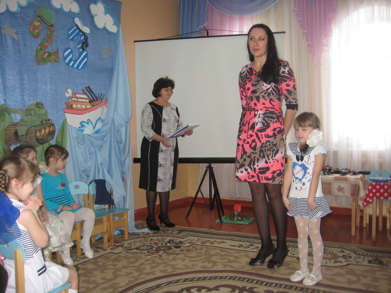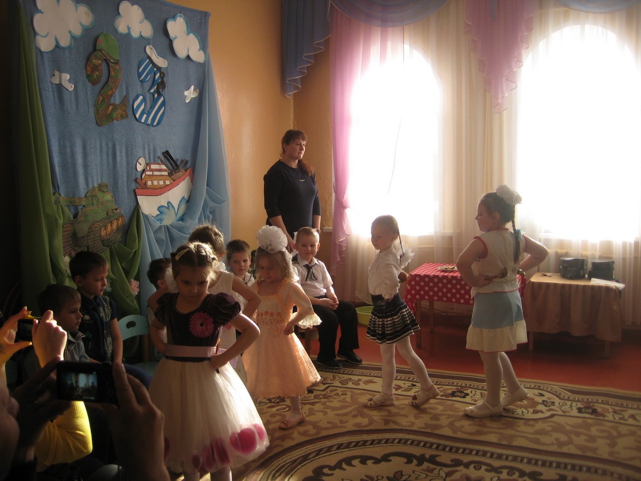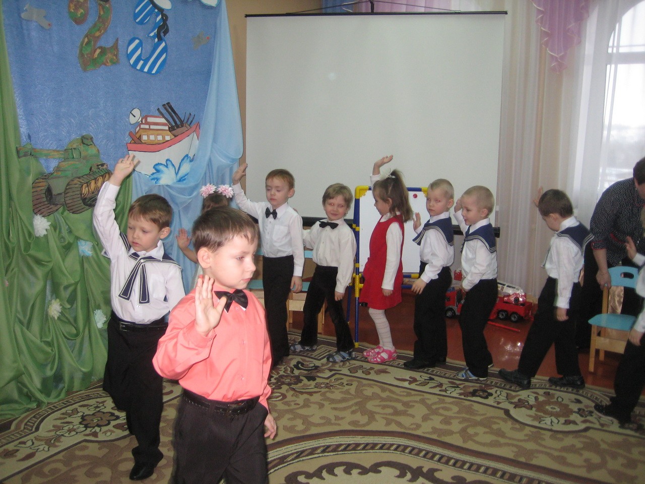 В детском саду, в средней, старшей и подготовительной к школе группе, прошли праздничные мероприятия, посвящённые Дню Защитника Отечества. Мальчишки и девчонки поздравляли пап и дедушек с этим замечательным праздником, подарив им песни, танцы, частушки, открытки, приготовленные своими руками.