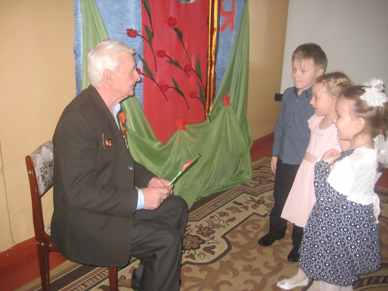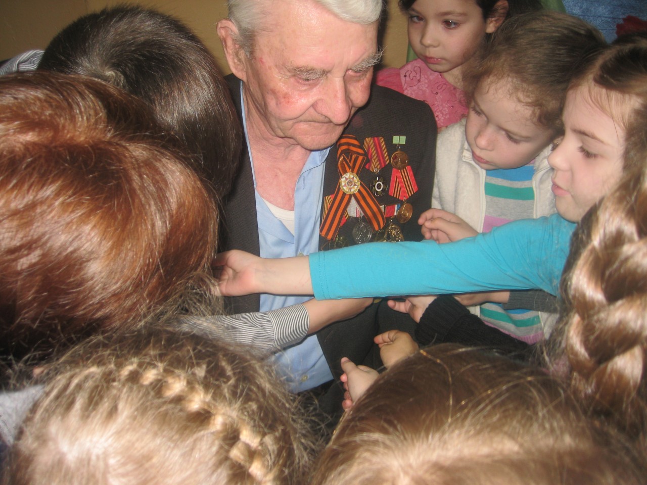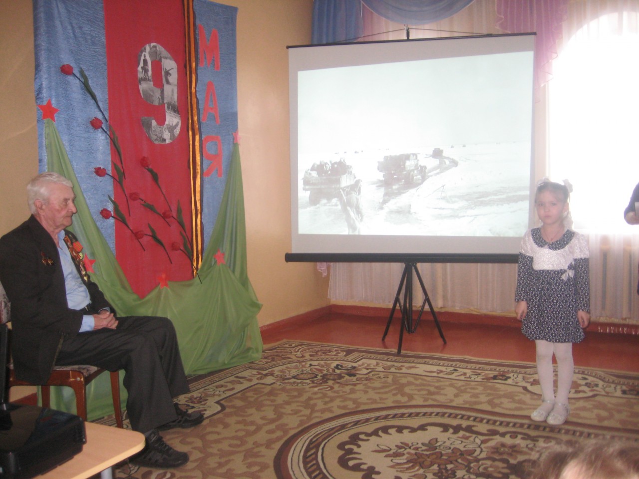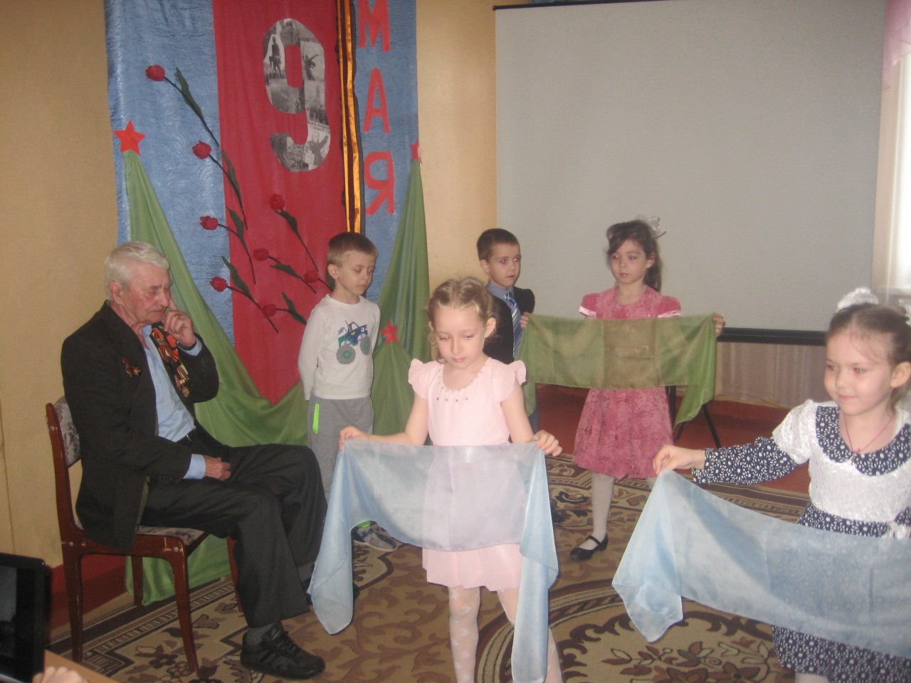 Дети с большим интересом слушали рассказ - воспоминание о том, что пришлось пережить Владимиру Николаевичу во время блокады. В исполнении воспитанников звучали стихи, песня «О мире», танец «Синий платочек».
